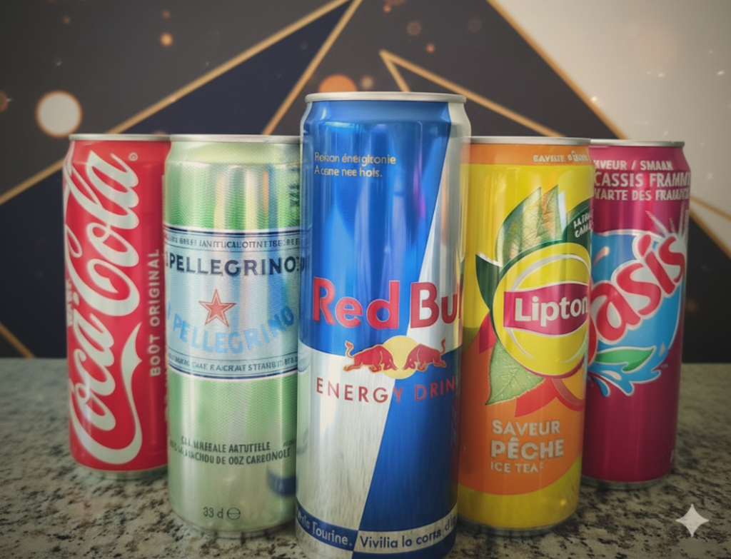 Coca Cola, San Pellegrino, Lipton pêche et Oasis cassis framboise 33cl à 2.30 € et Red bull 33.5 cl à 3.00 €